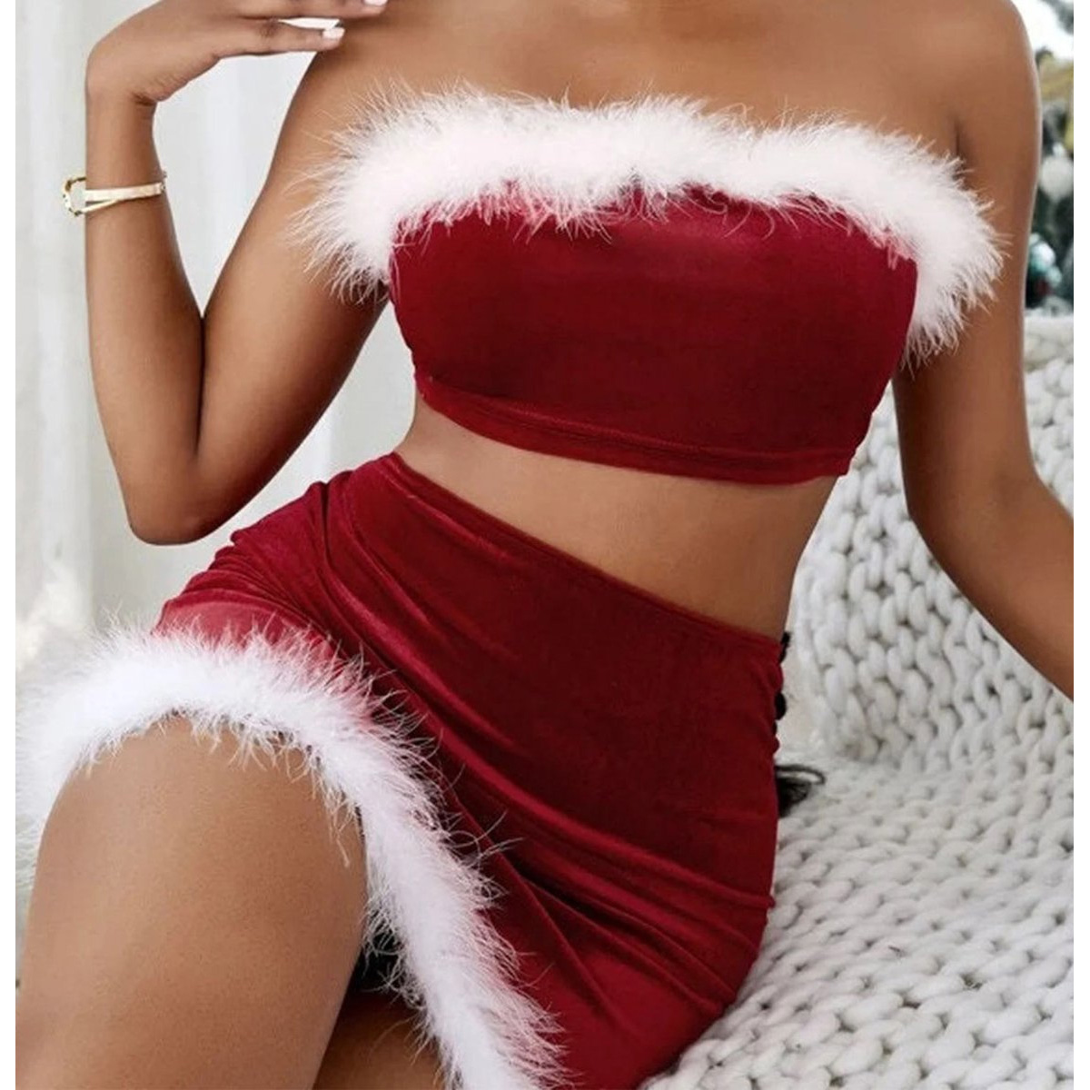 Betover de feestdagen met een vleugje ondeugende elegantie in deze Sexy Kerst dress. Deze prachtige set, bestaande uit een sensuele top en rok, is doordrenkt met de feestelijke geest van Kerstmis in weelderig fluweel rood.