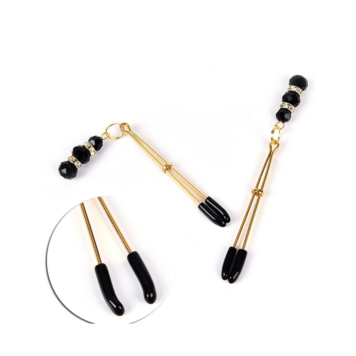 Set van 2 verstelbare tepel- en schaamlipklemmen met rubberen laagje, medium intensiteit, met diamanten steentjes. Geschikt voor beginners, 8 cm lang, goud/zwart.