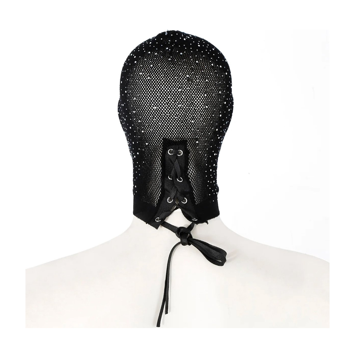 Stap in de wereld van ondeugende verleiding met onze transparante bivakmuts BDSM, een betoverend accessoire dat speelsheid en mysterie combineert. Gemaakt van hoogwaardig materiaal, omarmt deze glinsterende zwarte bivakmuts de sensualiteit van het onbekende terwijl het een vleugje luxe toevoegt met parelaccenten. De achterzijde is verstelbaar middels veters waardoor het een one size model is voor vrouwen met kledingmaat tot en met L.